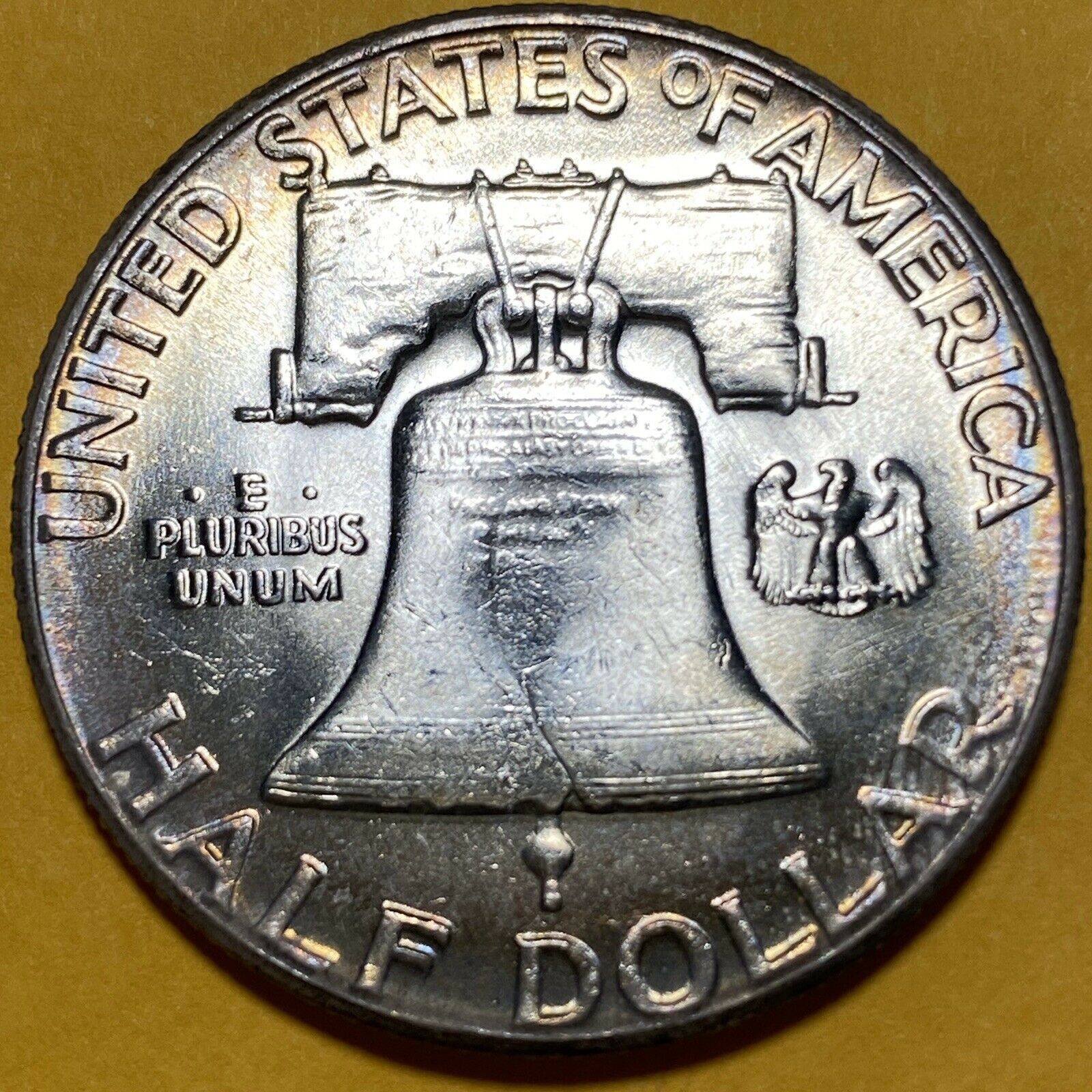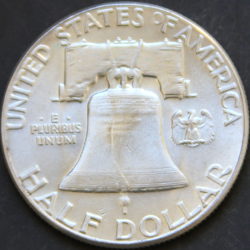 1961-P Franklin Half Dollar, BU, Rainbow Toned rev.jpg